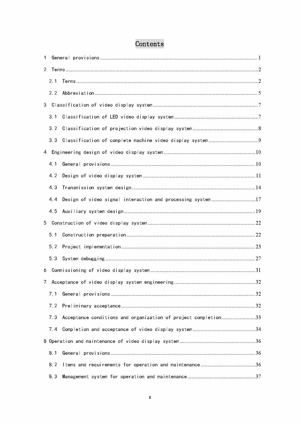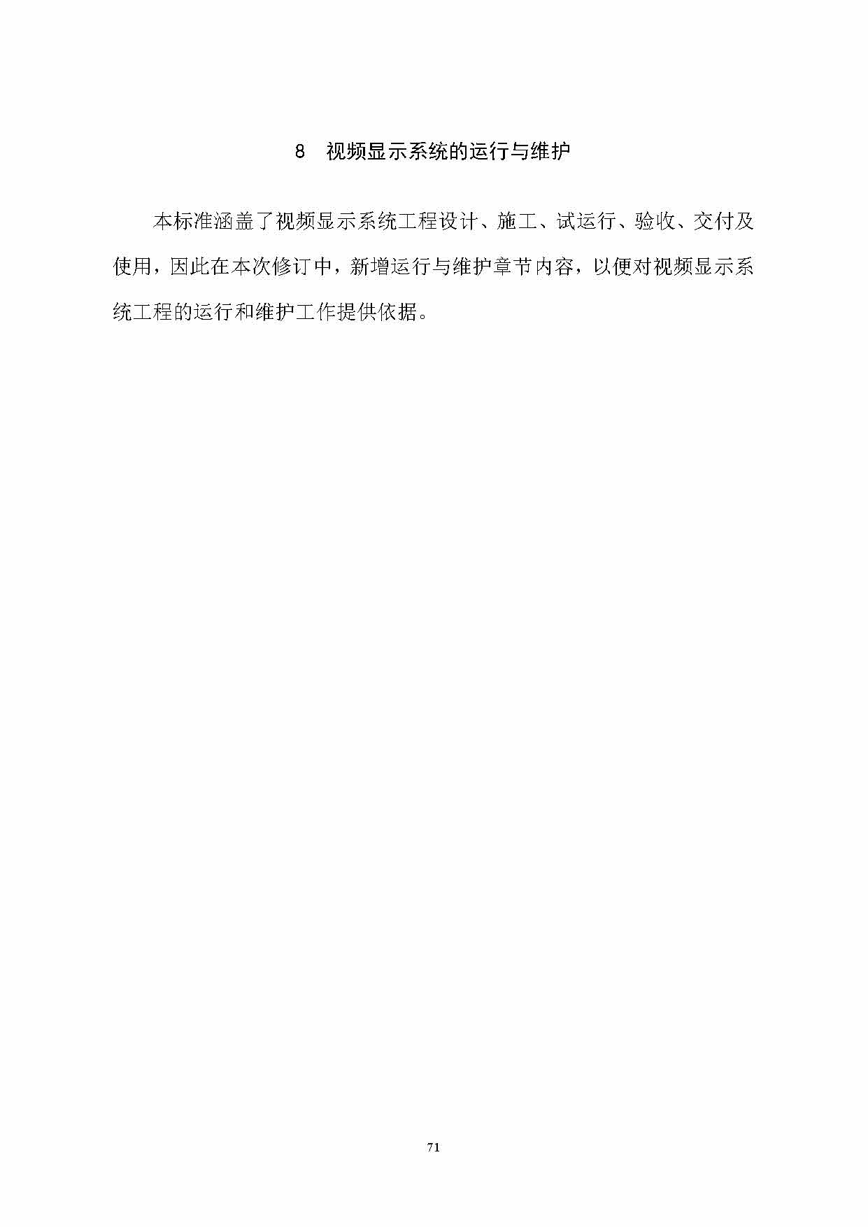 本標(biāo)準(zhǔn)共分8章和4個附錄。主要內(nèi)容包括:總則、術(shù)語、視頻顯示系統(tǒng)的分級和分類、視頻顯示系統(tǒng)工程設(shè)計、視頻顯示系統(tǒng)工程施工、視頻顯示系統(tǒng)試運(yùn)行、視頻顯示系統(tǒng)工程驗收和視頻顯示系統(tǒng)的運(yùn)行和維護(hù)等。