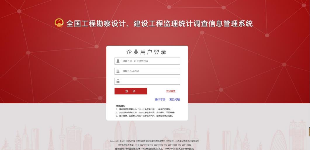 打開瀏覽器(建議使用 IE 10 以上瀏覽器或者 360 瀏覽器極速模式),地址欄處輸入 http://jzsctjbb.mohurd.gov.cn/ 回車,則打開“全國工程勘察設(shè)計、建設(shè)工程監(jiān)理統(tǒng)計調(diào)查信息管理系統(tǒng)”,如下圖 1-1-1 所示: