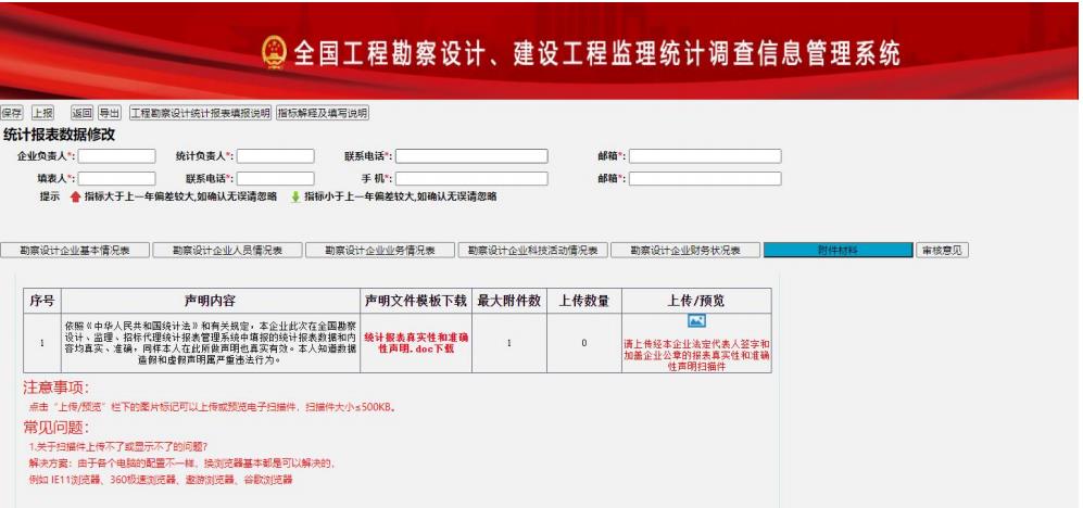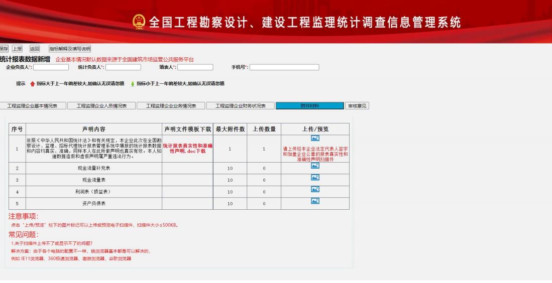 工程監(jiān)理收入超過1 億元人民幣(財務(wù)閥值)的企業(yè)需要申報財務(wù)證明材料掃描件:統(tǒng)計報表真實性和準確性聲明、資產(chǎn)負債表、利潤表(損益表)、現(xiàn)金流量表、現(xiàn)金流量補充表等附件材料的上傳, 進行報表上報,如圖 1-3-5 所示: