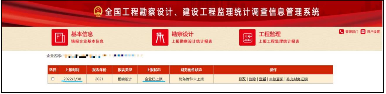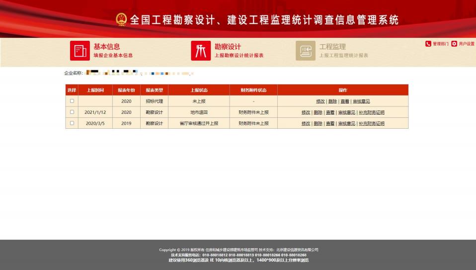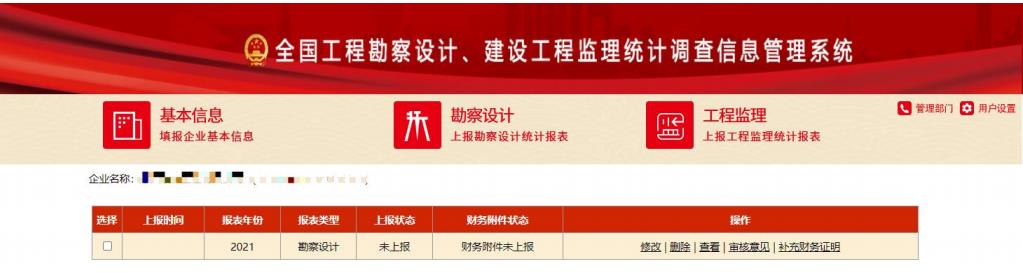 記錄顯示區(qū):顯示當前企業(yè)在本系統(tǒng)里填報的統(tǒng)計調(diào)查記錄,“操作”列顯示該記錄對應(yīng)的操作按鈕。如:修改、刪除、查看、審核意見、補充財務(wù)證明等。