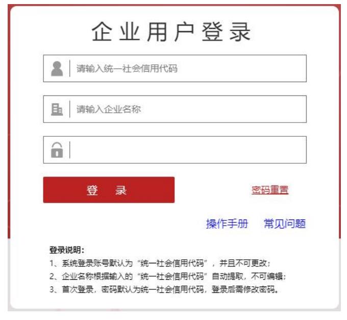 企業(yè)用戶登錄,登錄名默認為本企業(yè)的18位統(tǒng)一社會信息代碼。輸入統(tǒng)一社會信用代碼后,則企業(yè)名稱將自動提取顯示。企業(yè)名稱默認顯示本企業(yè)的企業(yè)名稱。首次登錄,密碼默認為統(tǒng)一社會信用代碼,登錄后需要修改密碼。