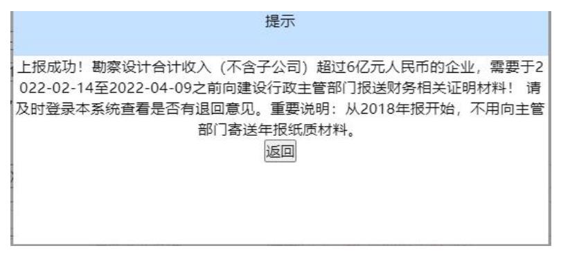 補充財務(wù)證明:企業(yè)填寫的財務(wù)狀況表中“工程勘察收入+工程設(shè)計收入”大于等于財務(wù)閥值(例如:2020年度報表要求6億)時,上報成功后,系統(tǒng)會提示:“勘察設(shè)計合計收入(不含子公司)超過6億元人民幣的企業(yè),需要于XXXX-XX-XX至XXXX-XX-XX之前向建設(shè)行政主管部門報送財務(wù)相關(guān)證明材料!請及時登錄本系統(tǒng)查看是否有退回意見。重要說明:從2018年報開始,不用向主管部門寄送年報紙質(zhì)材料。 ”。如下圖所示: