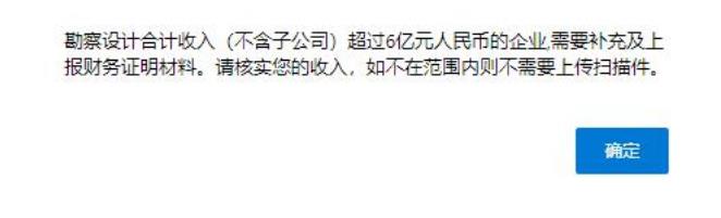 1、補充財務(wù)證明按鈕,只對“工程勘察收入+工程設(shè)計收入”大于等于財務(wù)閥值的記錄,開放補充功能。不滿足財務(wù)閥值的企業(yè),點擊后會彈出下面提示: