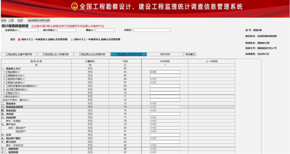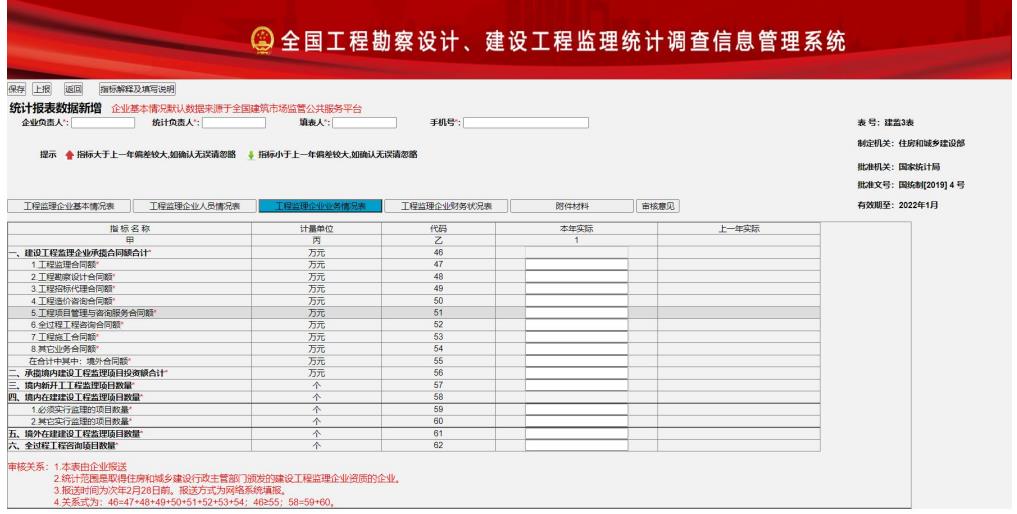 該模塊用于填寫工程監(jiān)理調(diào)查表內(nèi)容,包括:工程監(jiān)理企業(yè)基本情況表、工程監(jiān)理企業(yè)人員情況表、工程監(jiān)理企業(yè)業(yè)務(wù)情況表、工程監(jiān)理企業(yè)財務(wù)狀況表、附件材料(統(tǒng)計報表真實性和準確性聲明文件)等信息。