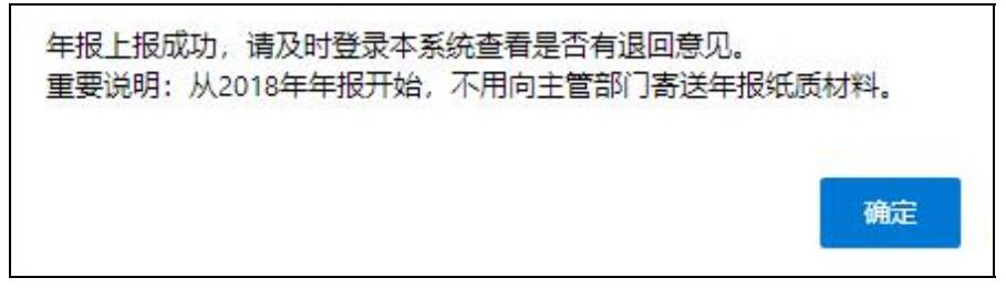 點擊“上報”按鈕后,報送成功,系統(tǒng)提示:“年報上報成功,請及時登錄本系統(tǒng)查看是否有退回意見。”如下圖所示: