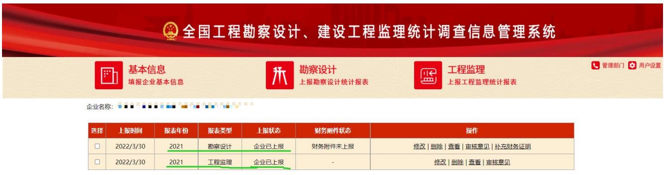 勘察設(shè)計、工程監(jiān)理統(tǒng)計報表上報后,報表列表狀態(tài)變?yōu)槠髽I(yè)已上報,如圖 1-4-4 所示: