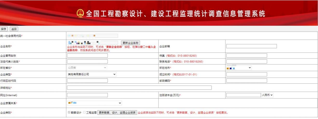 點擊主操作按鈕“勘察設(shè)計”按鈕,彈出提示窗口,點擊“確定”進入勘察設(shè)計企業(yè)填報頁面,錄入相關(guān)內(nèi)容,如下圖所示: