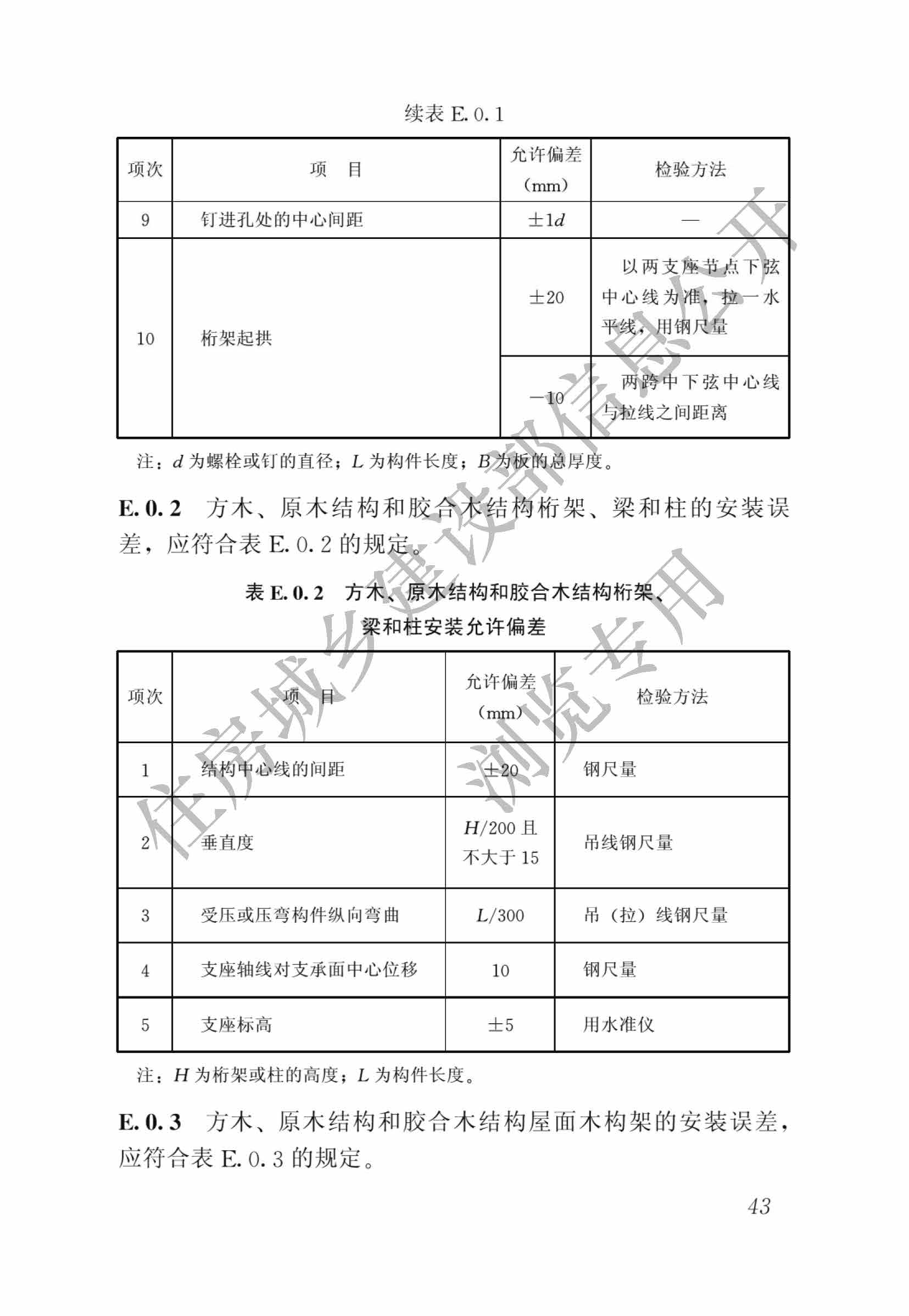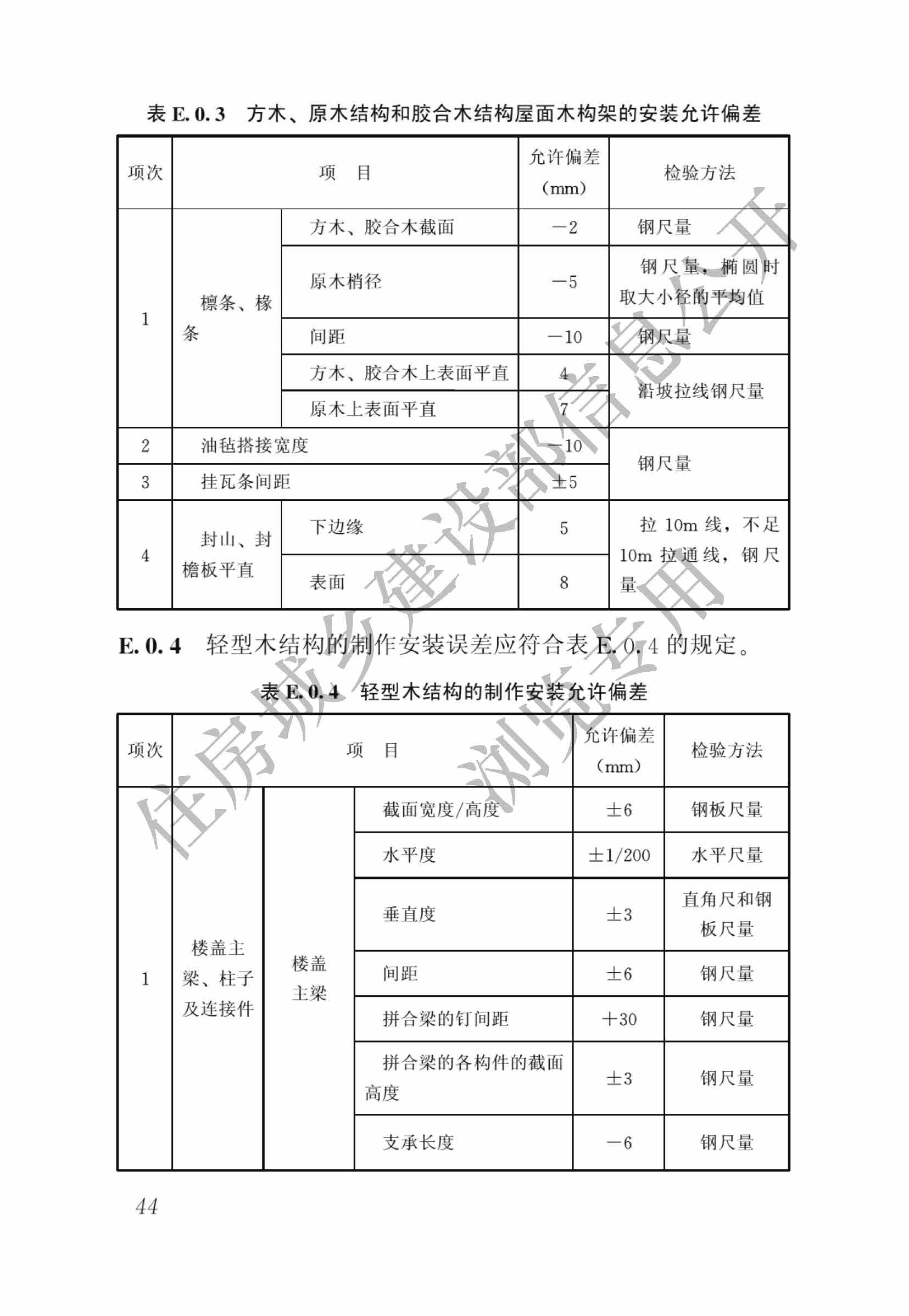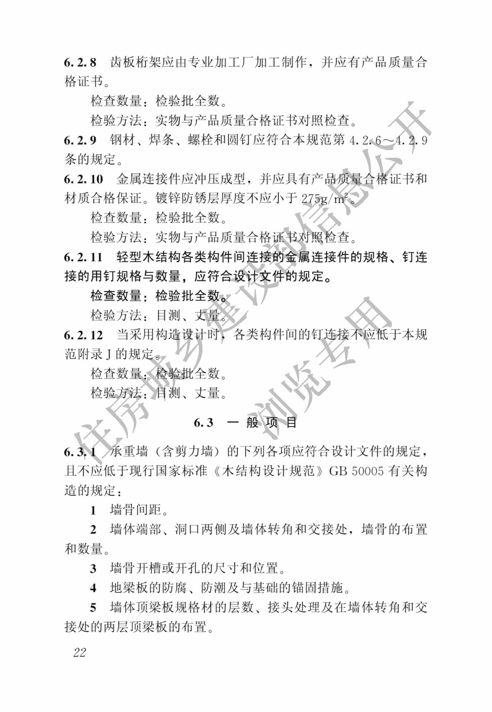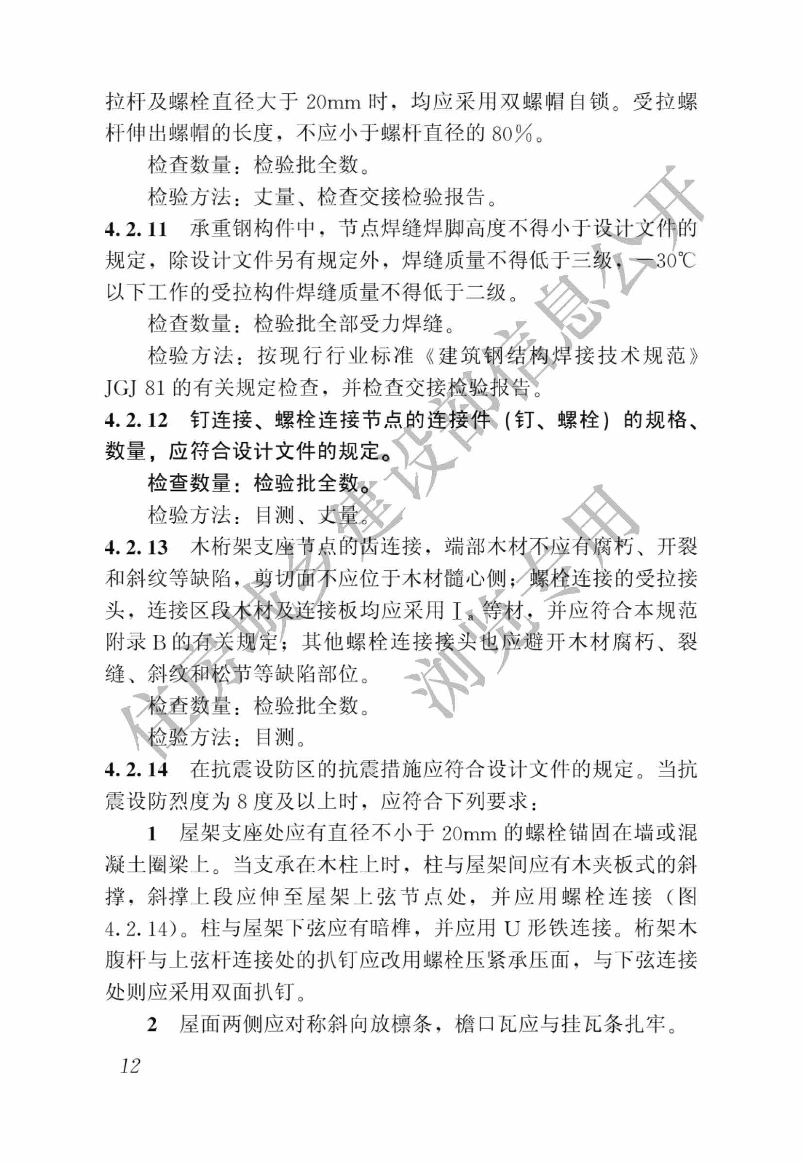 現批準《木結構工程施工質量驗收規范》為國家標準,編號為GB50206-2012,自2012年8月1日起實施。其中,第4.2.1、4.2.2、4.2.12、5.2.1、5.2.2、 5.2.7、6.2.1、6.2.2、6.2.11、7.1.4條為*性條文,必須嚴格執行。原國家標準《木結構工程施工質量驗收規范》GB50206-2002同時廢止。