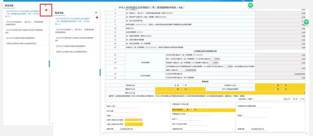 在【填寫申報表】頁面,左側為所有報表列表展示,點擊表單可進行切換;點擊側邊欄按鈕可隱藏報表列表,再點擊可顯示,選擇申報方式。