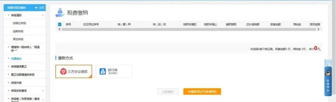 系統支持“三方協議繳款”和“銀行端繳款”兩種模式。簽署了“三方協議繳款”的納稅人可直接進行網上繳款。納稅人也可以打印銀行端繳款憑證,前往銀行繳款,注意需打印當天去銀行繳款。