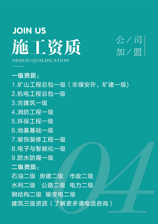安全保障工程設(shè)計(jì)乙級(jí)資質(zhì),工程咨詢甲級(jí)乙級(jí)資質(zhì),工程監(jiān)理甲級(jí)乙級(jí)資質(zhì),城鄉(xiāng)規(guī)劃資質(zhì),工程勘察資質(zhì),施工資質(zhì)等。