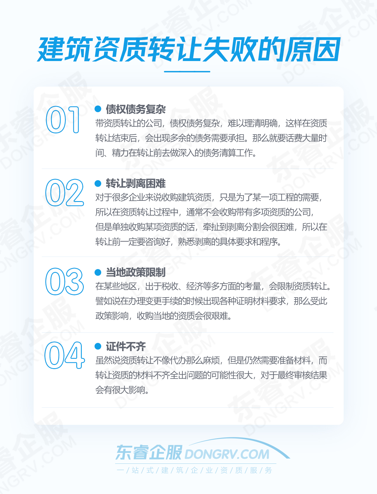建筑資質(zhì)的分立必須經(jīng)過政府部門的許可,因程序復(fù)雜,如果第一次資質(zhì)轉(zhuǎn)讓沒有通過,導(dǎo)致受讓方未能成功獲取資質(zhì),轉(zhuǎn)讓企業(yè)還有補救措施。(1)轉(zhuǎn)讓企業(yè)需將現(xiàn)有工程項目完成,以后項目不再使用該資質(zhì)進行施工。(2)轉(zhuǎn)讓企業(yè)收回應(yīng)當(dāng)收回的債務(wù),債務(wù)、債權(quán)需兩清。(3)轉(zhuǎn)讓企業(yè)需進行資質(zhì)信息公示:此資質(zhì)公司已轉(zhuǎn)讓,今后與己無關(guān)。