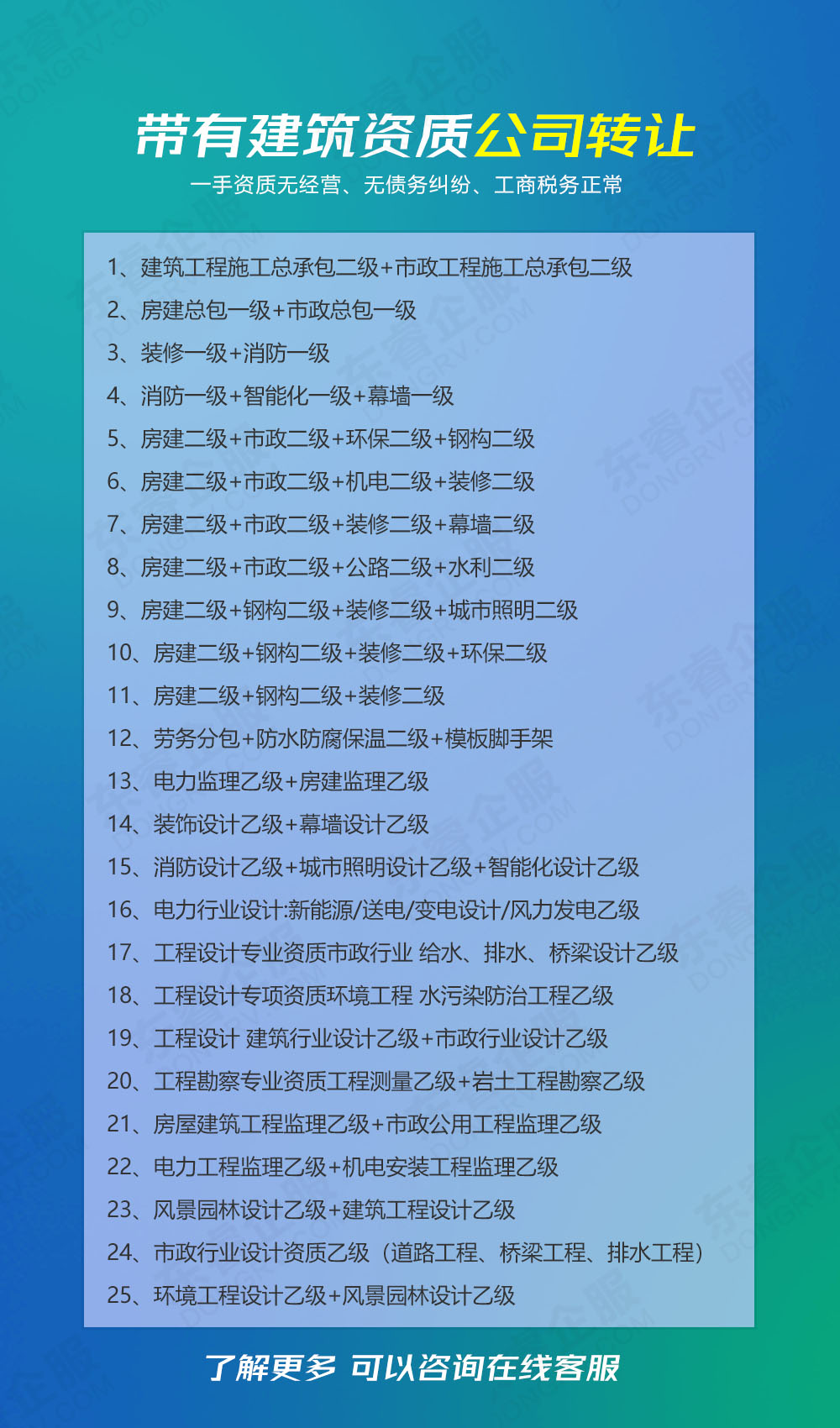 建筑工程施工總承包、公路工程施工總承包、鐵路工程施工總承包、港口與航道工程施工總承包、水利水電工程施工總承包、電力工程施工總承包、機電工程施工總承包、市政公用工程施工總承包、石油化工工程施工總承包、礦山工程施工總承包、冶金工程施工總承包、通信工程施工總承包