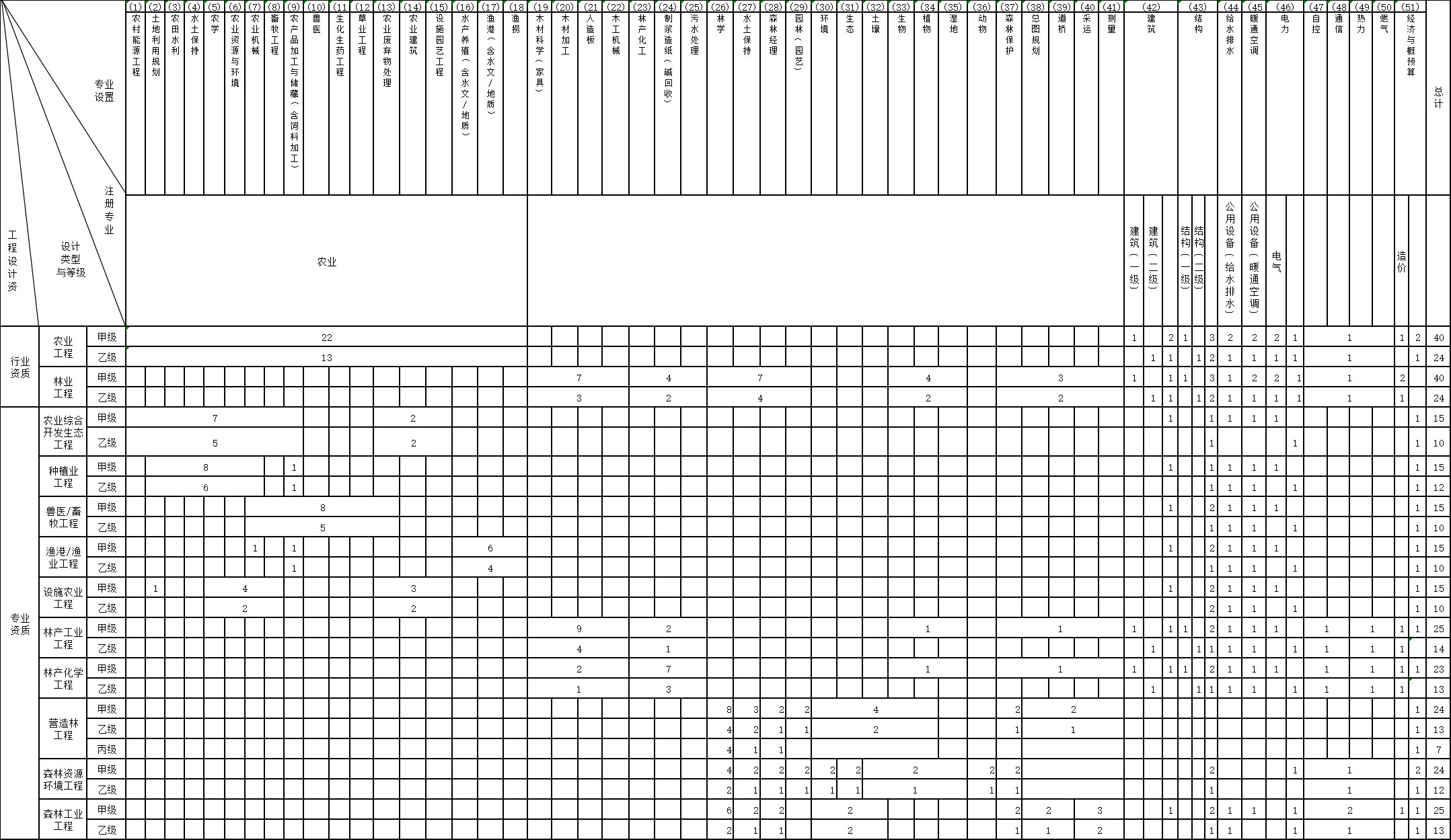 4、申請農林行業(農業工程)資質,在滿足專業技術人員數量的基礎上,(1)—(18)的工藝專業設置,甲級資質應配備其中至少12個專業;乙級資質應配備其中至少7個專業。