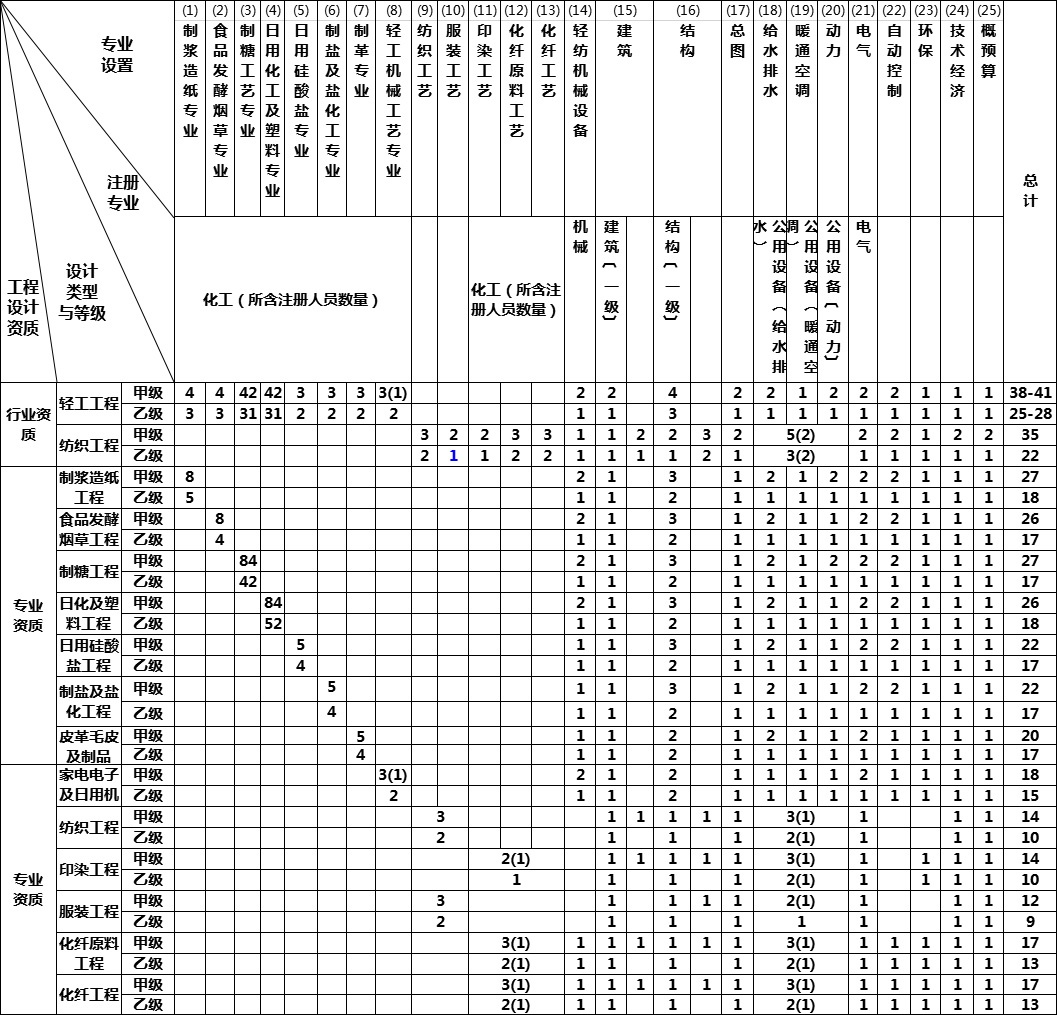 6.專業資質中,輕工類乙級資質和紡織類甲、乙級資質的專業設置,建筑專業也可配備2名二級注冊建筑師。